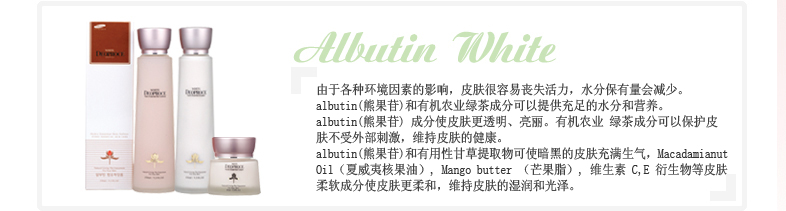 熊果苷和有机绿茶成分供应充分的水分和营养,熊果苷成分使皮肤白皙透明的护肤水。